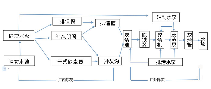 這種除灰系統(tǒng)的主要設(shè)備有高壓沖灰水泵、低壓沖水泵和噴嘴除灰器等。排渣槽和除灰器灰頭下的灰渣通過低壓沖灰水泵供給的水排出,噴嘴除灰器和噴射輸送用水則由高壓沖灰水泵供水。渣和灰與沖灰水混合后經(jīng)噴嘴除灰器送出。這種除灰系統(tǒng)輸送距離為3~5km。由于其效率低,耗水量大,一般只在間斷除灰的中、小型鍋爐使用。