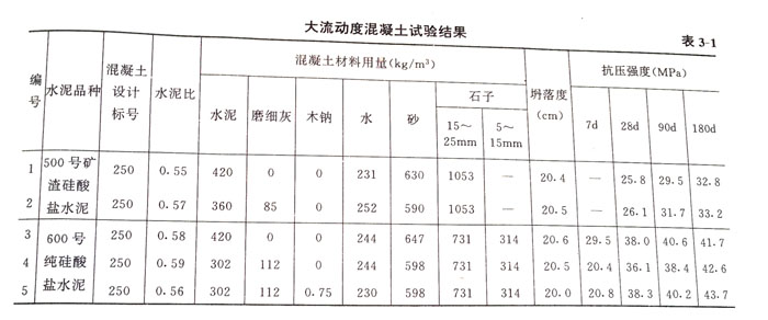 在大體積混凝土中,使用普通硅酸鹽水泥,由于水泥水化時(shí)硅酸三鈣(C3S)和鋁酸三鈣(C3A)作用發(fā)生熱量,Ig硅酸鹽水泥的總放熱量可達(dá)502J,因而導(dǎo)致混凝土溫度升高以至溫差收縮引起的裂縫。在普通混凝土中摻入粉煤灰后,水化熱明顯降低。表3—4是混凝土溫升狀況。由表列數(shù)據(jù)可知,摻30%粉煤灰與不摻粉煤灰的混凝土相比,絕熱溫升低27%~33%,較高溫升降低30%,并且可以減少或完全不需要人工冷卻措施。