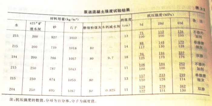表3—2是泵送混凝土強(qiáng)度試驗(yàn)結(jié)果。單摻磨細(xì)粉煤灰時(shí),7d強(qiáng)度可提高10%~17%,28d強(qiáng)度可提高26%~30%,60d強(qiáng)度可提高14%~28%。而當(dāng)磨細(xì)灰和木鈣減水劑雙摻時(shí),強(qiáng)度性能更好。7d強(qiáng)度可以提高22%~25%,28d強(qiáng)度可以提高50%~70%,60d強(qiáng)度可以提高30%~70%摻磨細(xì)粉煤灰和木鈣減水劑強(qiáng)度增長速率大,既提高早期強(qiáng)度,也發(fā)揮了后期強(qiáng)度。