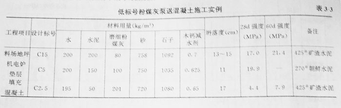 可泵性主要決定于混凝土與管壁之間的摩擦力。由于低標(biāo)號(hào)混凝土的水泥用量少,可泵性差,因此,過去規(guī)定C15以下的混凝土不得泵送??墒菗饺绶勖夯液蜏p水機(jī)劑后,可使混凝土在不增加水泥的情況下仍能獲得良好的可泵性。在寶電工程中,C2.5、C5和C15的混凝土在300m水平硬管輸送時(shí)也沒有發(fā)生堵塞現(xiàn)在。表3—3是低標(biāo)號(hào)粉煤灰泵送混凝土的施工實(shí)例。
