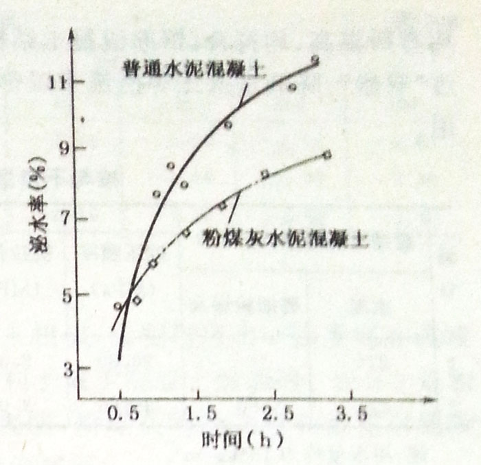 根據(jù)圖3—1所示,粉煤灰混凝土的總泌水率小于普通混凝土,說明粉煤灰土不易發(fā)生離析,有利于改善混凝土施工時(shí)的均勻性,提高混凝土的密實(shí)性和耐久性。